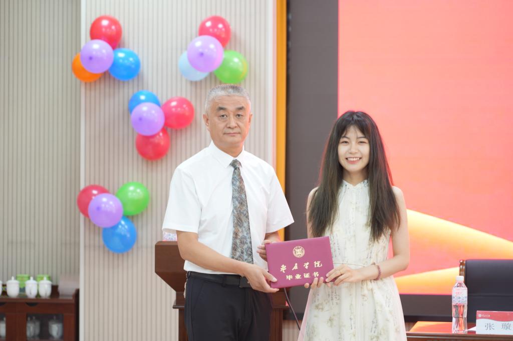会前播放了毕业短视频专题片,记录了毕业生在校园的青春风采与美好场景,表达了学院师生真挚祝福。会议宣读了《枣庄学院关于授予丁浩然等87名同学专科毕业证的决定》。会上,刘振宇为毕业生颁发毕业证书并合影留念。教师代表、在校生代表和毕业生代表分别进行了发言,表达了对学校和同学的深切情谊与美好祝愿。