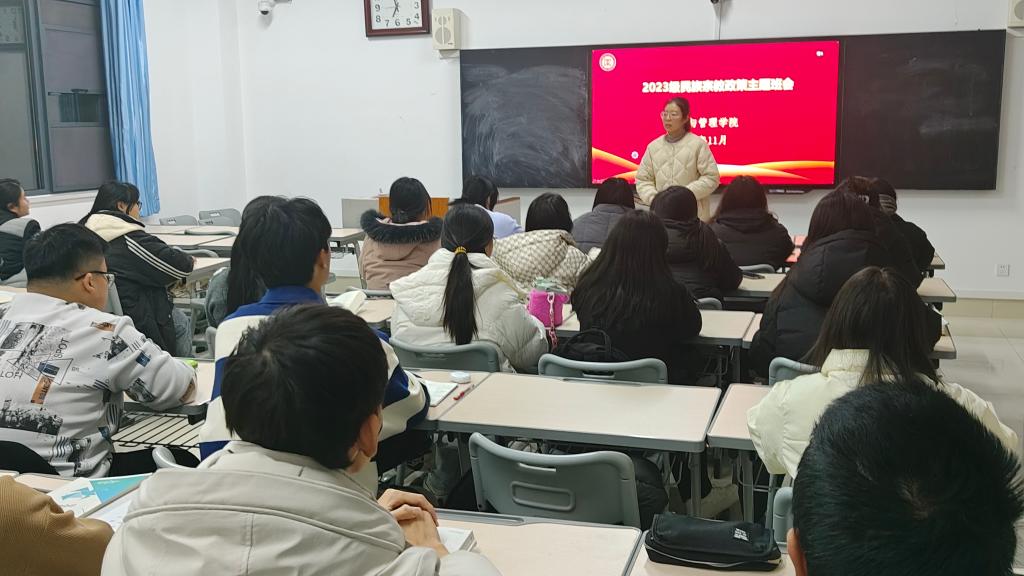 为深入学习贯彻习近平新时代中国特色社会主义思想,进一步提升大学生对民族宗教政策法规的认识,切实增强政治意识观念,铸牢中华民族共同体意识。11月28日,千亿QY88官网在豁然楼A317室举办民族宗教政策法规宣讲主题教育活动,2023级新生代表参加。