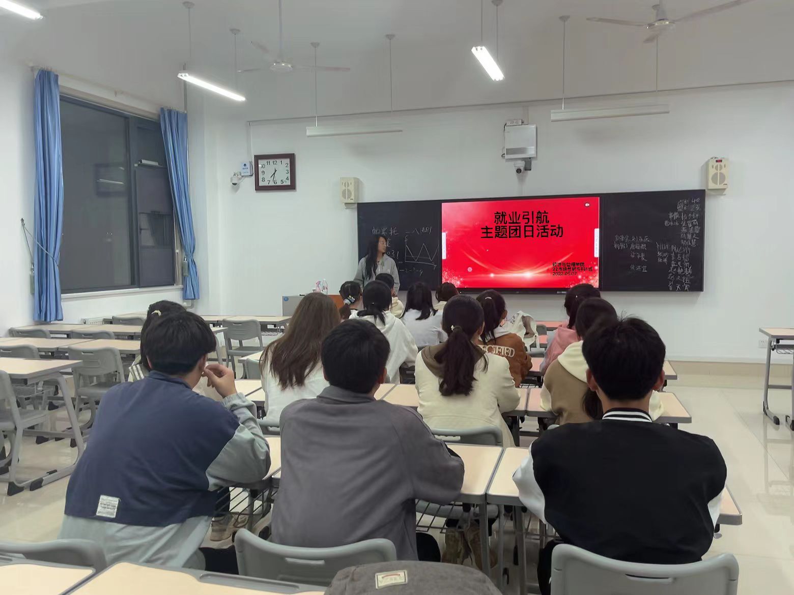 5月3日,千亿QY88官网以班级为单位开展了“就业引航”主题团日活动,活动过程中,主持人播放了近几年来有关大学生就业择业现状的相关视频,并就当代大学生的就业现状和职业分享自己的看法和思考。